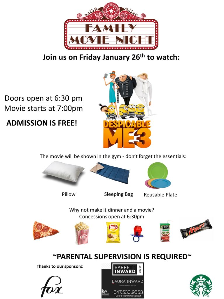 Movie Night is a fun evening out for students and families. The School Council will be selling pizza, drinks, and treats to help raise funds for school initiatives.
