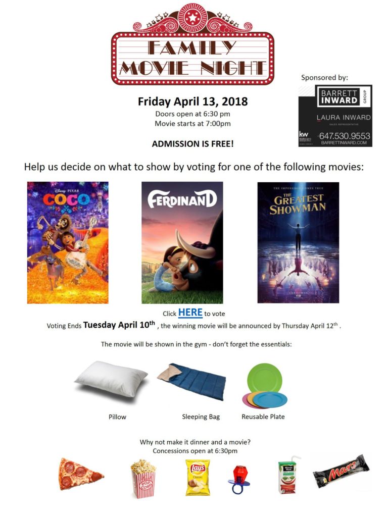 Movie Night is next week, Friday April 13th. Please vote for the movie you would like to see. Poll closes on Tuesday. Vote here: https://www.surveymonkey.com/r/VRV56TX
