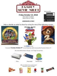 Our 1st Movie Night is next Friday October 12th and parents are to vote for which movie their kids like. The movie with the most collective votes win. Attached poster is going out to all parents tomorrow or Thursday from Mr. Yee to vote and we are also directing them to the council website. Voting closes Tuesday.