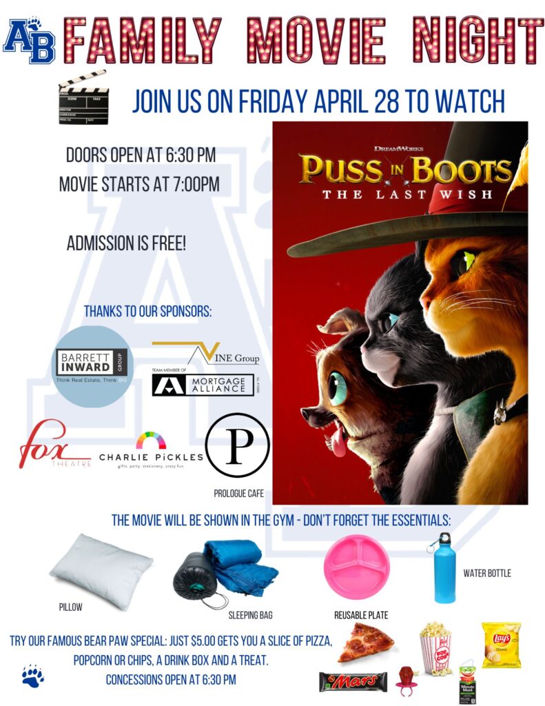 Join us in the gym on Friday, April 28, to watch Puss in Boots: The Last Wish. Remember to bring your pillow and sleeping bag/blanket and a reusable plate for pizza. Doors open at 6:30 p.m. and the movie starts at 7 p.m.
