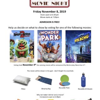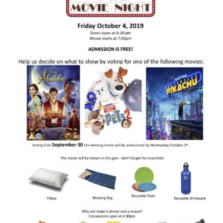 Our 1st Movie night is next Friday, October 4th. Please help us choose which movie to vote for by voting here. For all the details on this family event, visit the Movie...