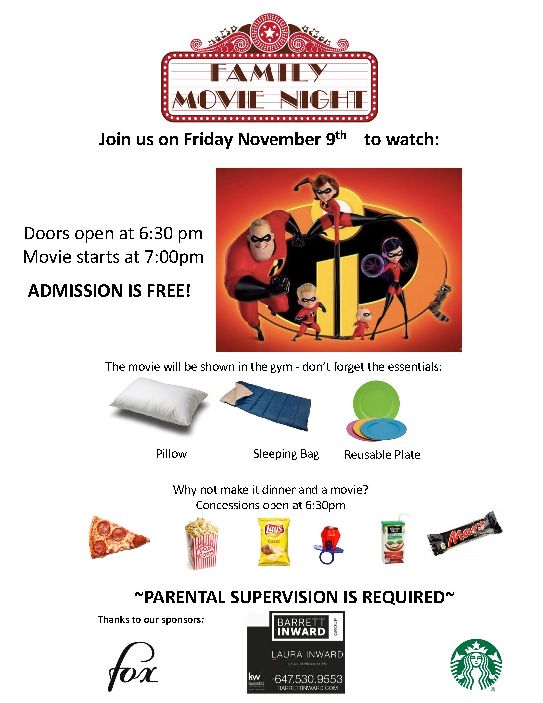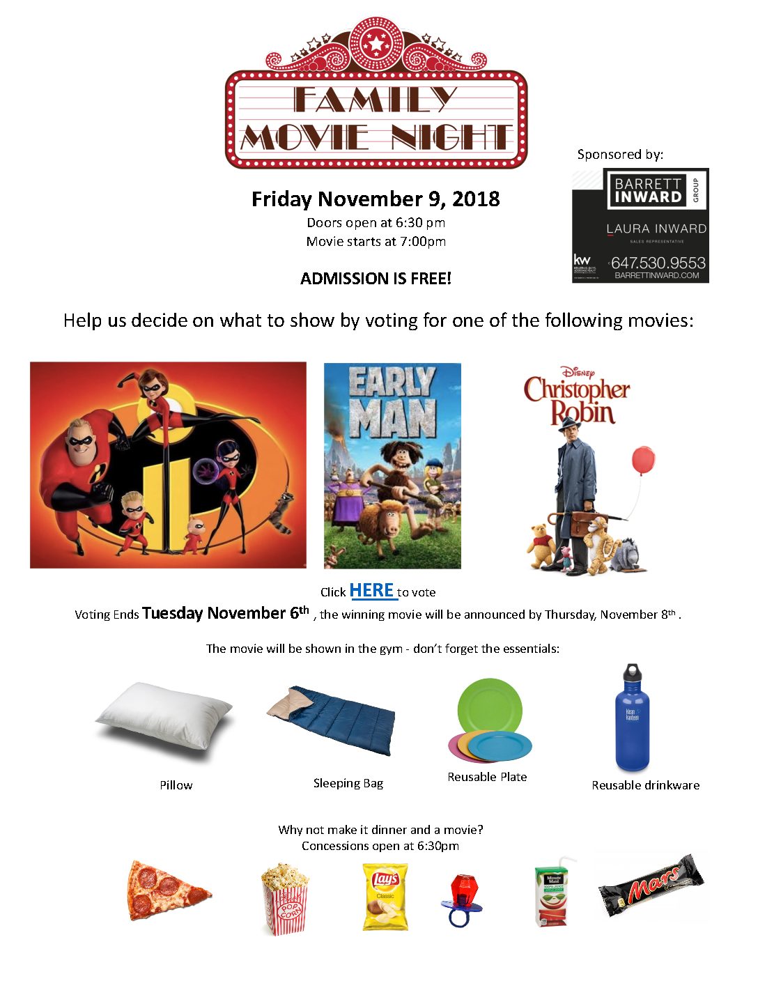 Our 1st Movie Night is next Friday October 12th and parents are to vote for which movie their kids like. The movie with the most collective votes win. Attached poster is going out to...