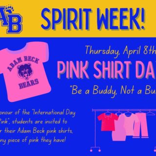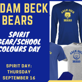 This year Adam Beck is going to show school spirit by having MONTHLY Spirit Gear/School Colour Days!! Our first one will be Thursday September 16th. Students are encouraged to proudly...